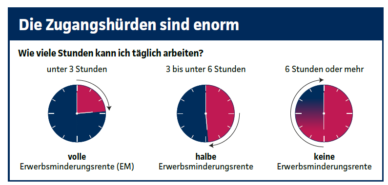 Sie wird nur dann gezahlt, wenn Sie gar keiner Tätigkeit mehr oder nur sehr eingeschränkt (weniger als drei Stunden täglich) nachgehen können und die Zugangsvoraussetzungen erfüllt haben. Auch die Rentenhöhe ist meist zum Leben zu wenig.
